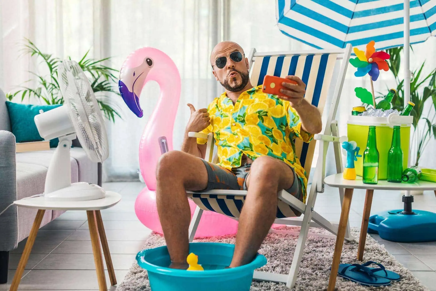 Buntes Sommer-Setup mit Flamingo-Inflatable und Getränkekühler.